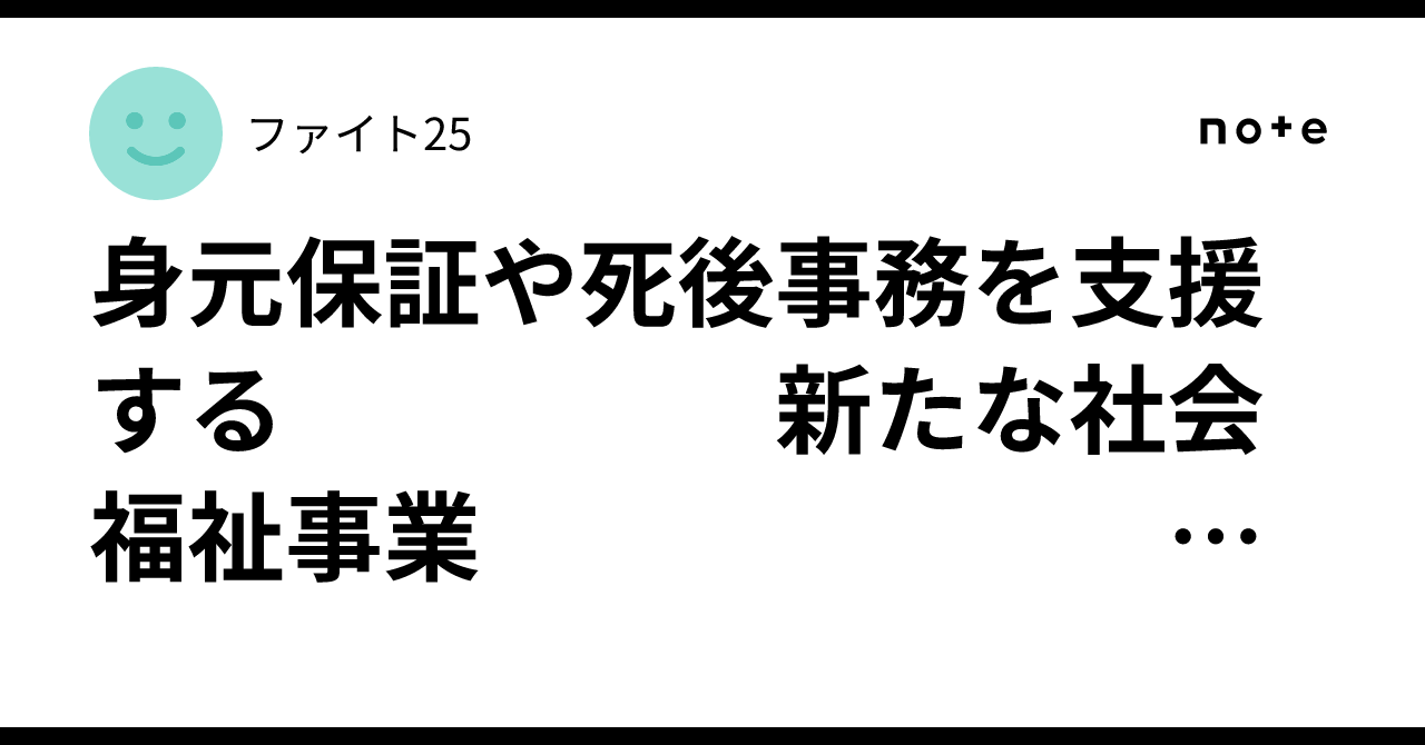 身元保証や死後事務を支援する 新たな社会福祉事業 「身元保証等高齢者サポート事業」や 「高齢者等終身サポート事業」 この新事業は、日本在住の外国人や |ファイト25身元保証や死後事務を支援する 「新たな社会福祉事業」は、一般的に 「身元保証等高齢者サポート事業」や 「高齢者等終身サポート事業」 移民労働者・外国人への対応 この新事業は、日本在住の外国人や 移民労働者も対象となる 地域で「孤立させない」仕組み作りが目指 多言語対応:支援パッケージの中で、外国人が意思決定や手続…note.com