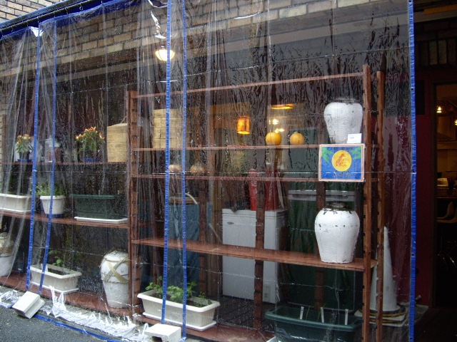 そんなイメージをかもし出そうと、店の外に棚を作り、野菜や雑穀をプランターで有機栽培してみたり、紹興酒の甕を置いたり、セイロを飾ったりしてみてます。