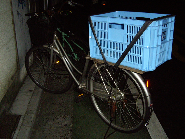 この自転車の前後のデッカイ籠でも、まだ足りず、ハンドルの両サイドにも、ハマチ1匹やら、大根3本やらぶらさがってたりします。