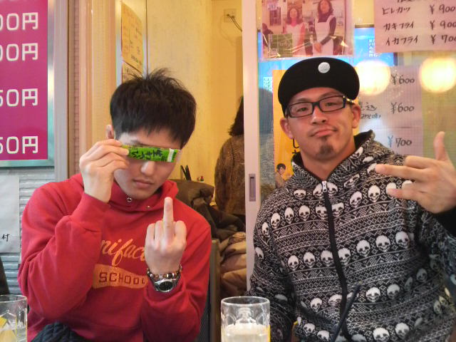 津田沼道場の津田選手と○○選手(顔隠してるので匿名w)。お昼過ぎに集合して、お参りの後とりあえずご飯を…って話になったんだけど、私が年長者の権限で昼から乾杯に変更♪