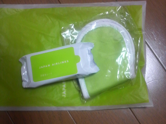 そして、エコノミーなのに、スリッパやらアイマスクやら制汗シートやら可愛いパックに入ってプレゼントしてくれる。JALはアルコールも飲み放題だし最高♪(ノースは1杯500円)