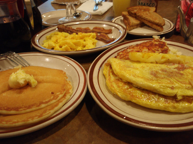 私は名物のパンケーキの食べ放題と卵2つ、ベーコン2枚とコーヒーがセットになって$6.99という、ジャンボリー・ブレックファースト、母はオムレツセットとサラダをオーダー。