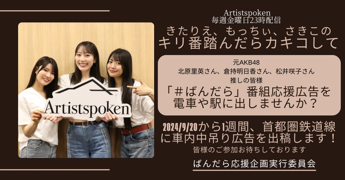 「元AKB48:北原里英さん、倉持明日香さん、松井咲子さんがパーソナリティを務める「きたりえ、もっちぃ、さきこのキリ番踏んだらカキコして(通称:ばんだら)」の番組応援広告を首都圏の電車内に出しませんか?」を企画しました! sakaseru.jp/mina/event/da666f0d2591a43b97afab57e3aaa94f #ミンサカ #minsaka