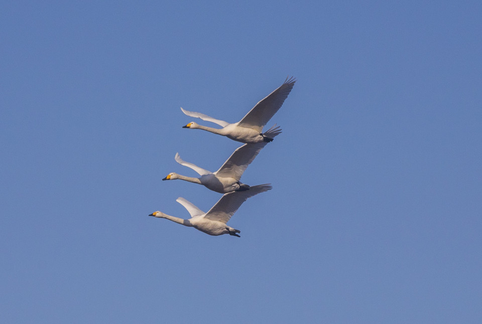 さらに空を見上げると、北に帰るハクチョウが、ウォーミングアップのように飛んでいます。