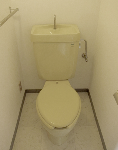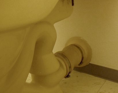続いて、トイレ。後ろを覗き込むと汚水排水が壁につながって