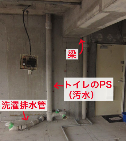 隠れていました。そして、お風呂と洗濯機の排水は隣の部屋にあるPSに