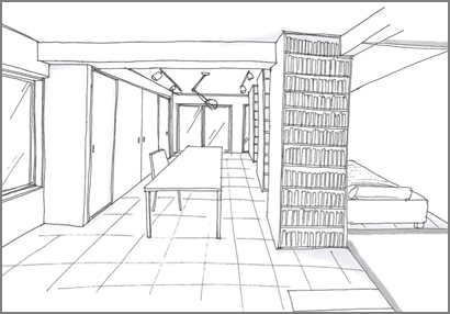 本棚を壁として扱い、本で囲まれた寝るスペース案です。