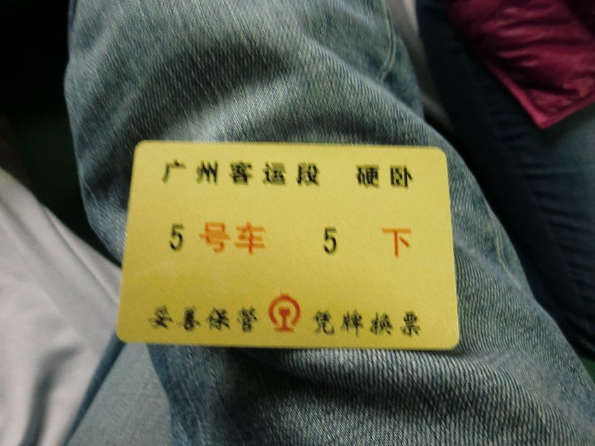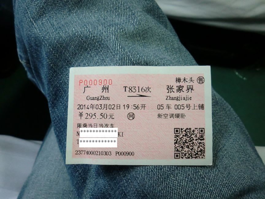 これが広州~張家界への夜行寝台列車です。19:56発で、明朝9時頃到着予定、無事に着くのか??心配です。長距離列車にはパスポート番号と同時に名前まで入るんですよ~~個人情報漏洩だ~~