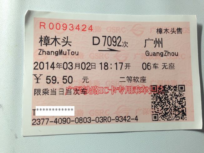 上記の切符は広州駅、までの切符?約60元=17倍ですから1,020円程度です。安くはないです。