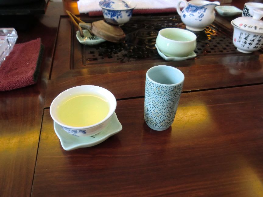 ただし、中国の飲み方は日本人から見ると雑な扱い?料理を食べる時の同じですが、先ず食器を熱湯で消毒する。そして最初は小さな茶色の綺麗な湯飲みに注ぎ ます、下には本来の湯呑が敷いてあり、小さい茶色のお茶の入った湯飲みを持って、下に敷かれた湯飲みを上に乗せてひっくり返し手前右側の写真の様に湯呑一 杯になっている状態です。そして飲みます。ま、これが一番茶って事でしょうか??