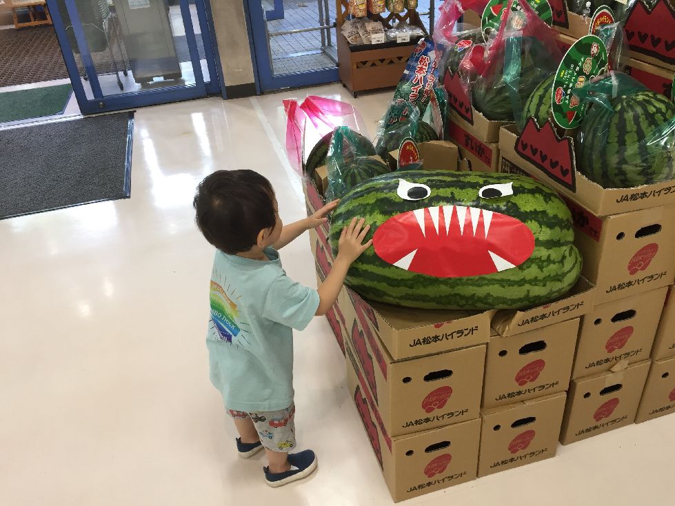 店舗の1階野菜売り場のフロアに、どデカい西瓜を見つけて触りまくってます。