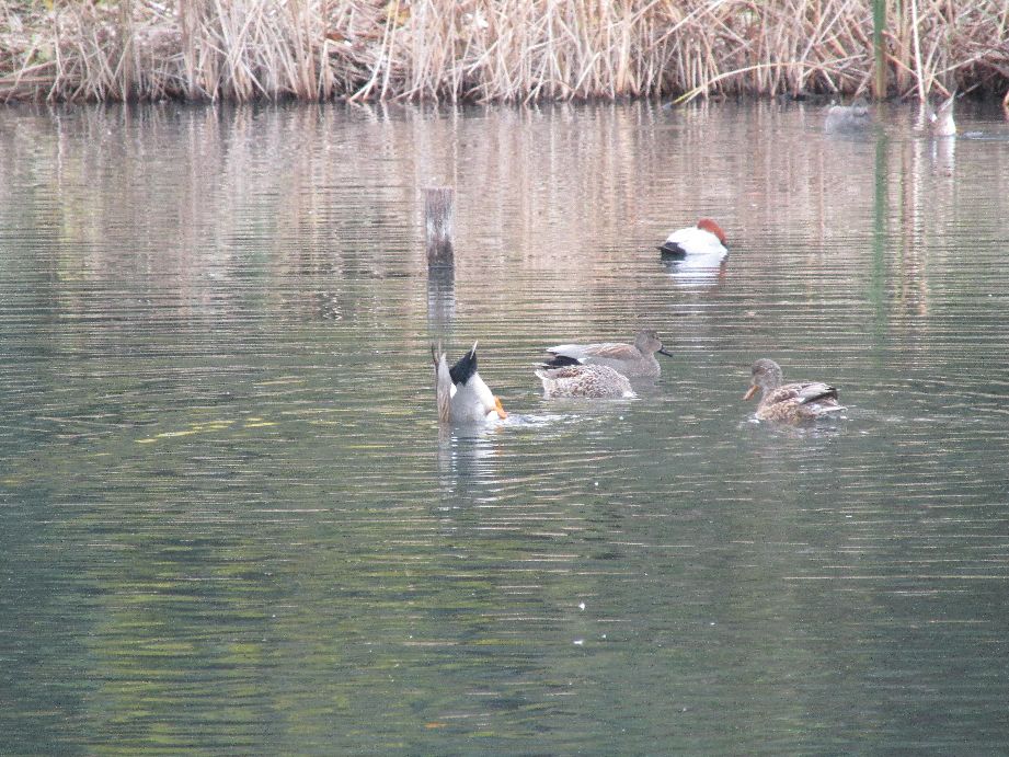 お腹が空いているのか?餌が多いのか?カモ達は池に頭を突っ込んでいますね。尻尾が黒く羽は真っ白?頭は茶色のカモ達も居ますよ。