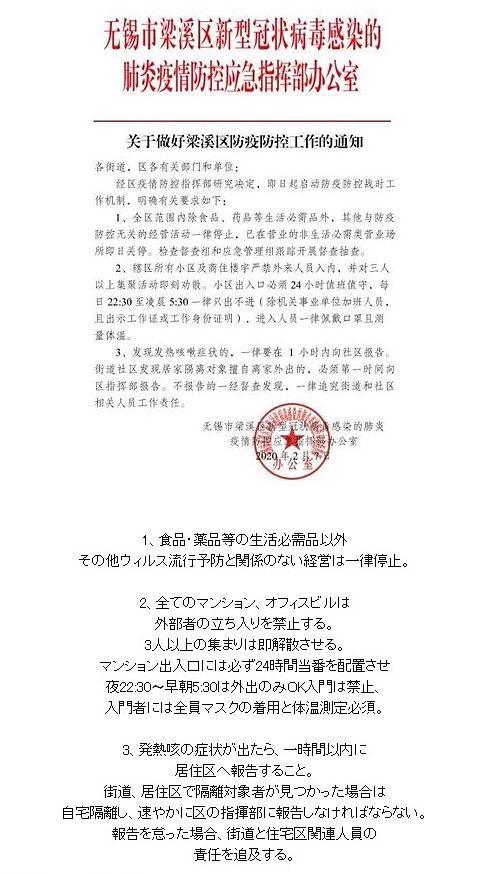 中国全土の及ぶコロナウイルス感染に伴い、街や村にマンション等の個別的に防衛策並びに忠告文を発しているそうです。先日は湖北省の有る都市の忠告文でしたが、各個別に順守すべき事柄の様子です。