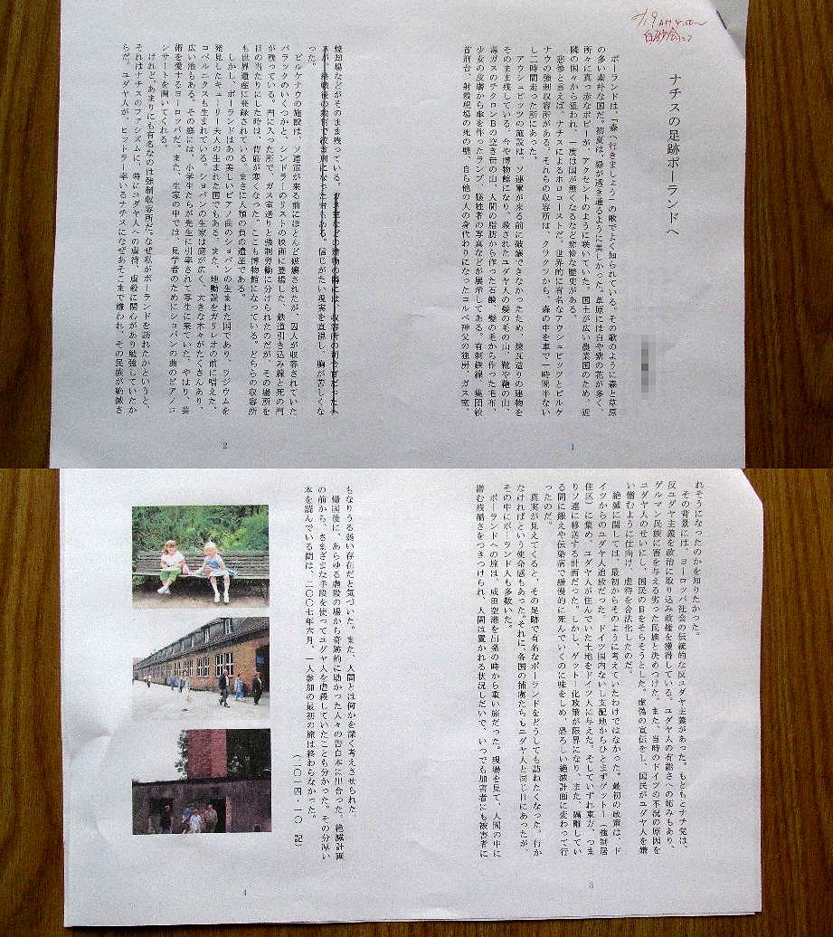 さて、本題。マドンナからの報告は個人旅行での思い出としてポーランドの「アウシュビッツ」を観光して、悲惨な現状が保存されている内容でした(悲しい出来事ですね)ガス室へ入れられて上から毒ガスが放出されると人間は本能的に生きる行動が起きる、ガスは下に溜まって上に上がる訳だが天井側の空気を求めて人の上へ上へ上がったであろう実態が伺える、弱い赤ん坊に老人と続き弱い女性が積み重なっていた模様、生きる強い人ほど上に重なって亡くなった修羅場であったのでしょう~