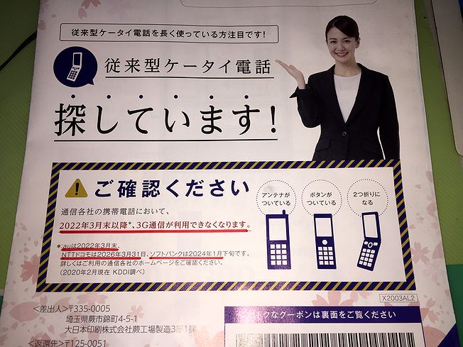 自宅に戻ると我が家のポストに広告が、内容は「3G回線が無くなる内容」様は従来の携帯(ガラケー)回線が廃止になる話、爺はとっくに知っている、しかし高齢者やガラケー利用のオジサマやオバチャマは意識なし、無くなるなんて無い筈だ~~と思っておられるのでしょう~~以下が証拠品^^