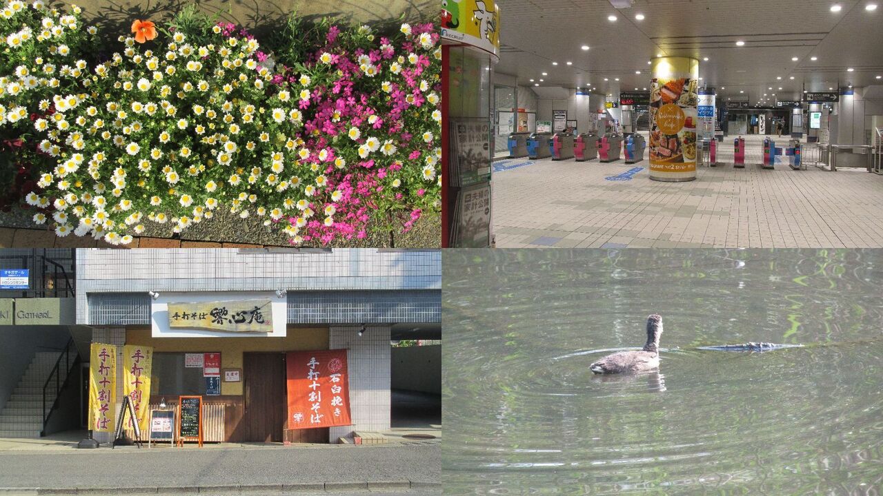 ケアプラザの花壇のお花です、上右は「〇葉〇駅」の改札口には人が見当たりません、GWで土曜日だからかな~~と思っていたら、僅かな人が改札を通過していました。