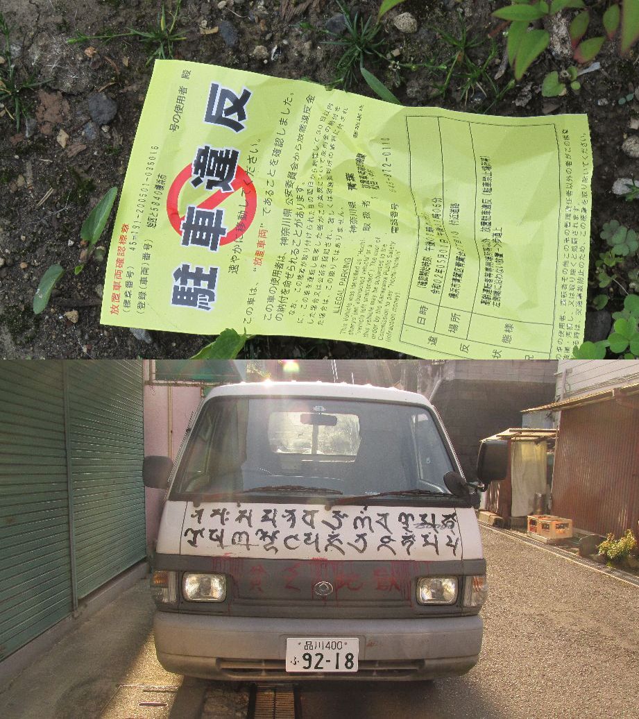 そして下の車に書かれている文字判りません??でも下の赤文字は日本語で「貧乏地獄」とあります。上の文字にも同様の訴えが書かれているのでしょうか?何方か訳してください^^