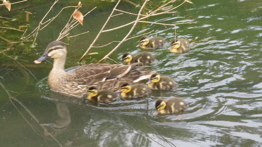 数日前にカルガモの雛を9羽?だったと思うが確認したのですが、今朝動画に収めようと池へ行くと多少とも近所の方々が見守っておられます。