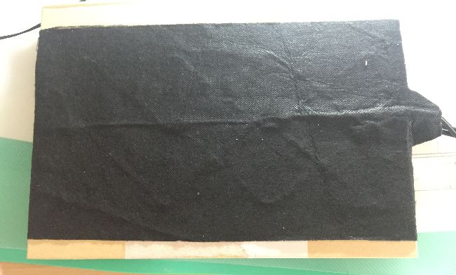 右側の布のケーブルが付いていて、布の内部に熱線が入っていて温度が上昇す仕組みです。それは板に張り付けたのが以下の写真^^