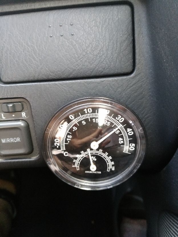 この温度は冷房を掛けており、通常の車内の温度と湿度です^^あくまでも100均の製品ですから、目安としての判断ですね^^炎天下時に車内に入ると45~50度を指しますよ。