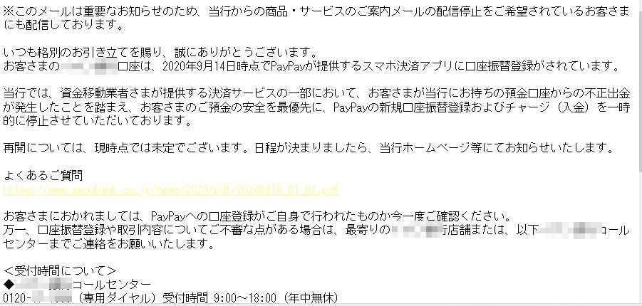 この内容は、docomo口座問題に関係してPyePyeへのお金が詐取されており、爺のPyePyeは銀行との関連で一旦口座よりPyePyeへの停止処理と取りました、との連絡です。被害があったのか無いのかも説明なし、実際には被害なしですが~もう少し早く連絡すべきで実害あれば改めて報告と追記して頂ければ安心ですけど~~