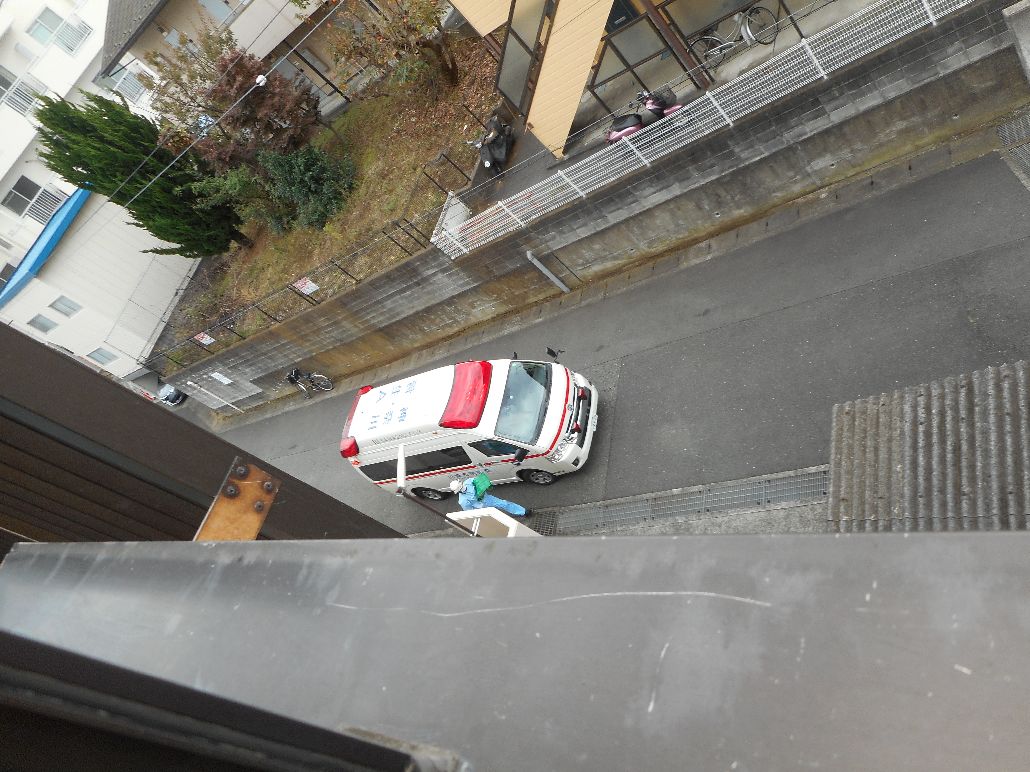 そんなある日、救急車が近くで止まりました??下を見たら、爺のマンションの玄関に救急車やないけ?