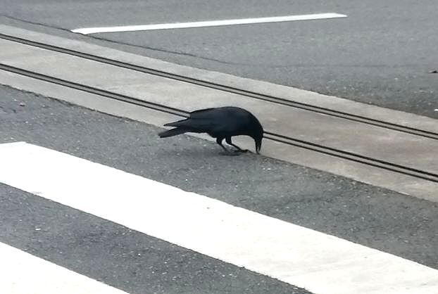 そして局を出たら、烏が2匹戯れていて逃げる様子もなく、何か見つけて突っついております。