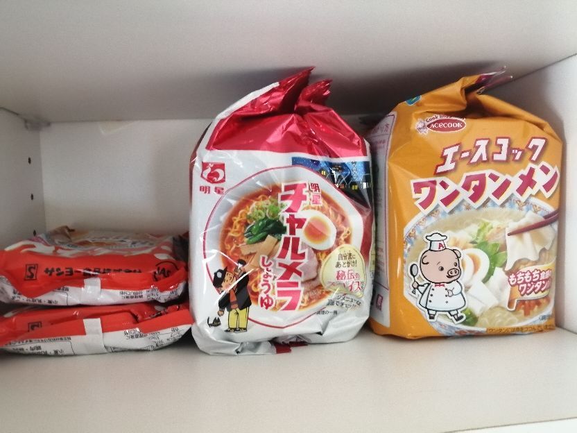 ははは、食器棚に婆さんが選んだインスタントラーメンです^^エースコックのワンタンに明星食品のチャルメラ^^です、爺は過去から好みであるサンヨー食品の札幌みそラーメンが2個残ってます。