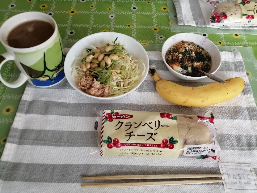 朝食の内容は、①サラダ、②バナナ(久しぶり^^)、③ヨーグルト、④パン、⑤マグカップのコーヒー