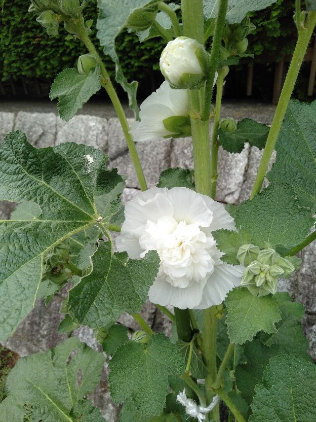 近所のお花「葵」が咲き始めましたよ~最近、散歩も疎かだし、買い物へも歩いて行かず車が多いな~~その弊害として、近所の観察が出来ておりませんね~~しかし今日は久々に歩いてスーパーへ行きました。 その際、気になっている「葵」ですが~若干開きだして状態です。 こんな感じ、こんなにも伸びるの~~??もう2mを超えたかな~~この枝は真っ白ですよ~ もっと大きな花だと思っていますたが、意外と小さい??他には紫が有るよと家主さんの話でしたが~ホンマかいな~~もう少し待ちましょう~1~2週間後には満開かも~~