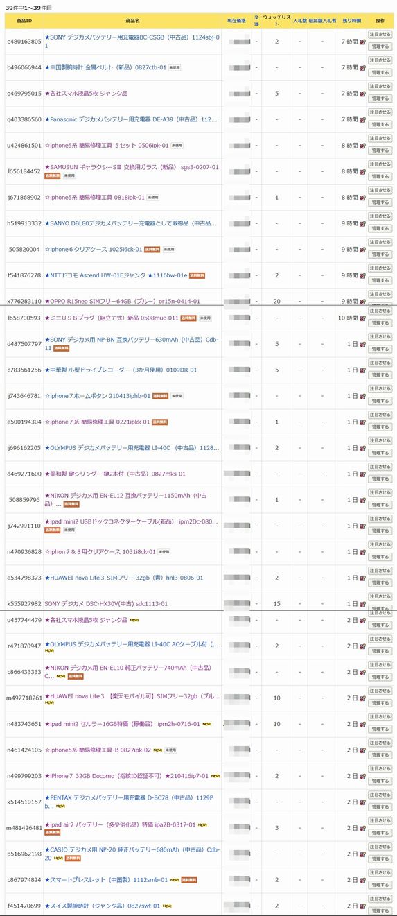 価格は隠させて頂きますが、ウオッチリスト(とは:見た方が気に成る、考えたい為にチェックを入れる)で10個以上のウオッチが5件以上ありますね、そうです落札頂ける候補としては角度が高いと言えますよ。価格は100円~1万円代レベルまで^^