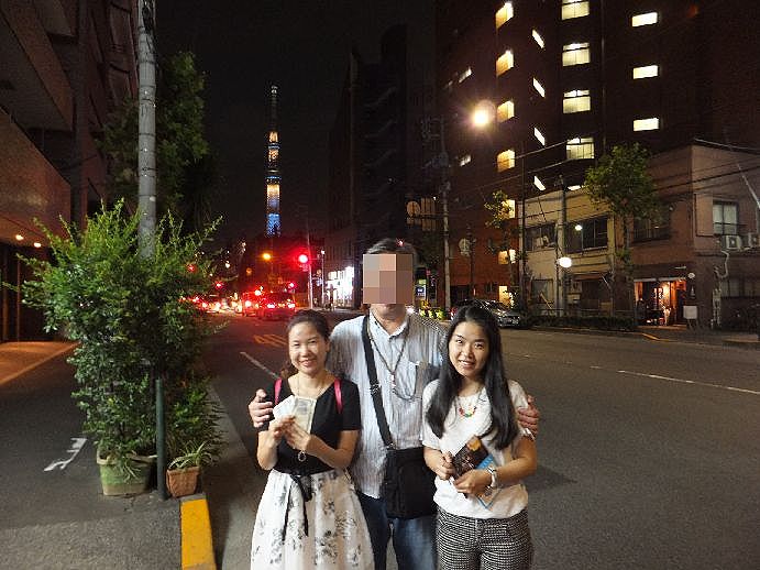 浅草の安ホテルを予約し、ホテルの前でホテルの方が記念写真を撮ってくれました。