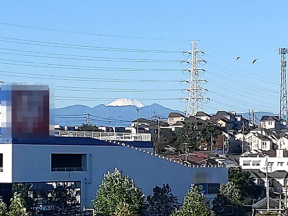 今朝(10/29)の富士山(^^)先日役所へ向かった際、西方面に富士山が見えましたもので、天気さえ良ければ我がマンションの屋上からも見えるだろうと、今朝屋上へ^^ アングルは高圧線が邪魔して最悪ですが~この時期富士山が拝めるのは幸せな気分ですよ^^ こんな事、爺婆にしか解らないのかな~~(苦笑)