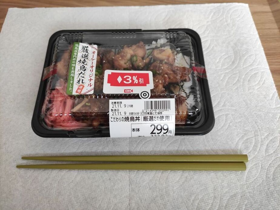 本来我が家から近いのは、生田店ですが~其処へも行ってませんね~宮崎店で必要品を買い込むと同時にお昼の食事を購入しましたよ^^それは「焼き鳥丼」です。安い上に3%引きでした。