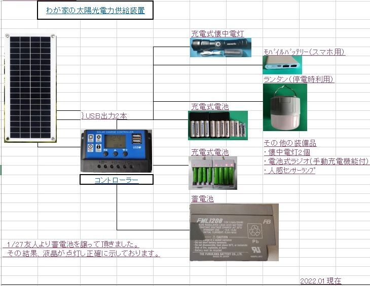 太陽パネルのコントローラーの表示も回復しており、蓄電池は友人から頂きました。そうなんです友人も爺の発案に引かれてか、パネルとコントローラーは国内で購入(6000円代だったとか?)され、2人とも情報交換し、ああでもないこうでもないとしつつ、完成に近づいてます。