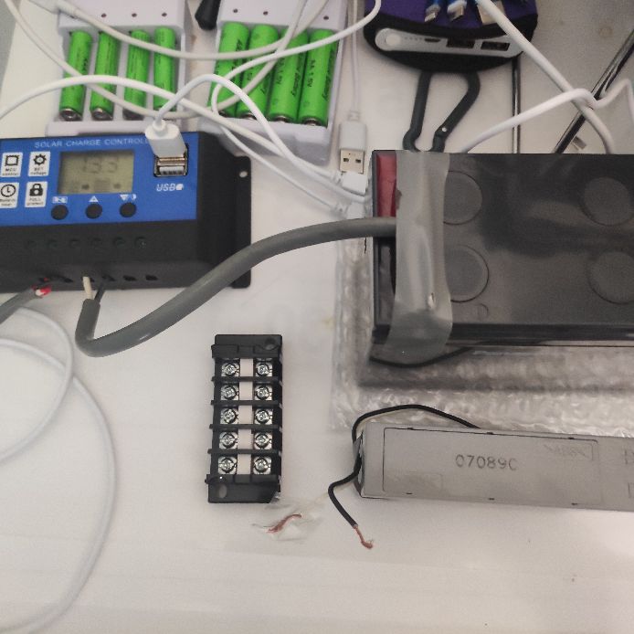未接続ですが、太陽光パネルの出力側から端子盤に繋ぎ、大小のバッテリーを平行に端子盤経由で接続予定です。これだと接触不良も無いと思いましよ。