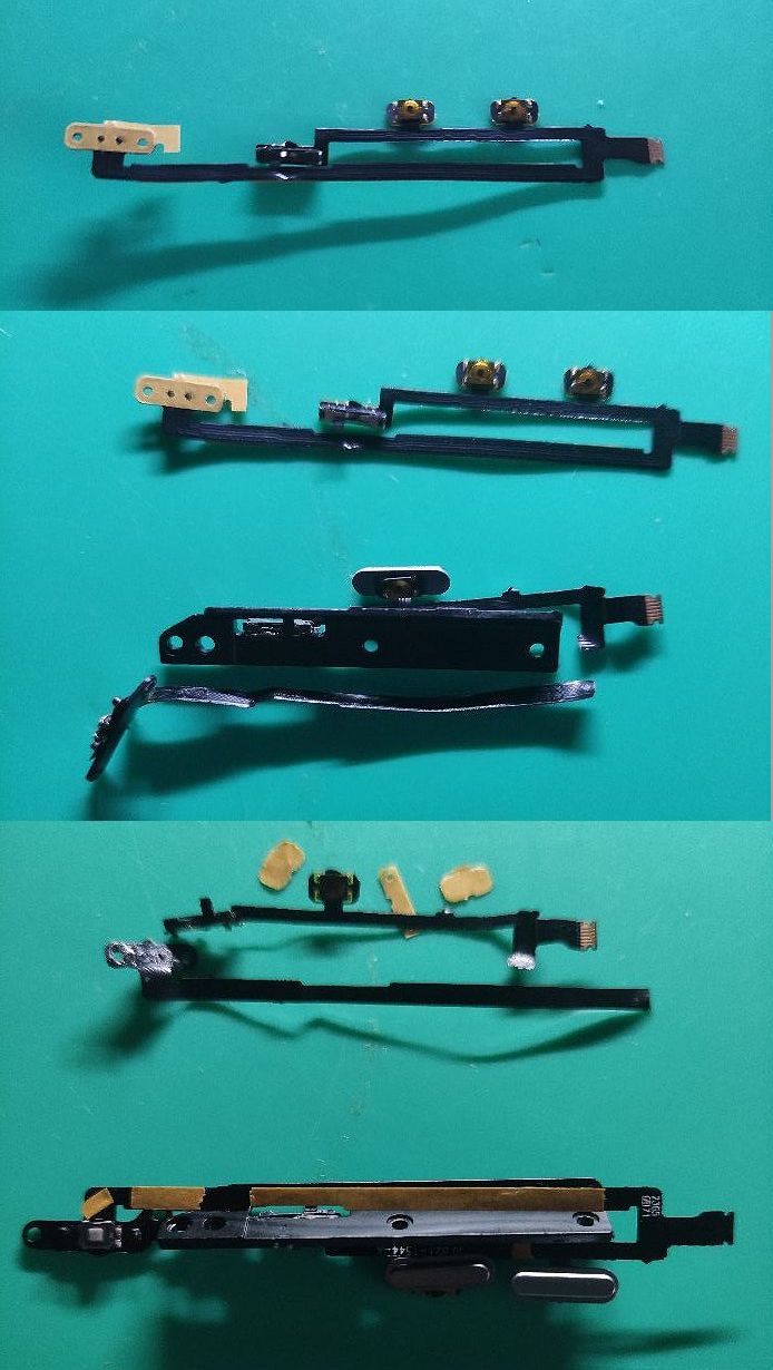 上段が、届いた部品です。中段はその部品とipad airから取り外した部品(ボタンが付いてますね^^)下段が全てを入れ替えて貼り付けた完成品ですね、その上に有るのが亡骸です^^。