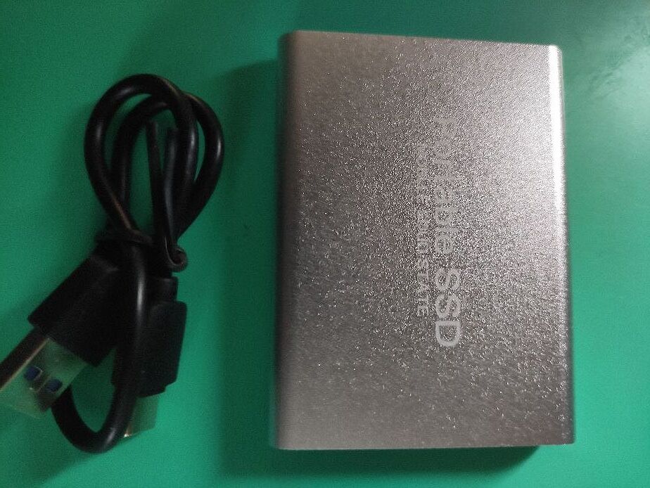 以下の通りシルバー色で「ポータブルSSD」と記載がございますね。付属にUSBケーブルが。