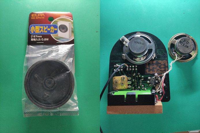 それはさておき、早速本体に装着して配線を半田付けしました。その前にワニ口クリップ付のケーブルで繋いで確認済です^^既設のスピーカーをラジオの背面から外して今回購入した物を装着しました。