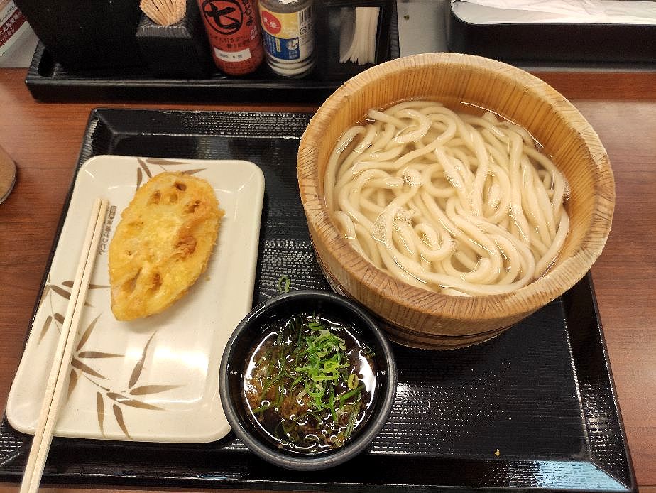 爺婆も「釜揚げ:普通サイズ」+爺はレンコンの天ぷらを注文しました。金額はうどん半額140円+天ぷら120円=260円でした~~
