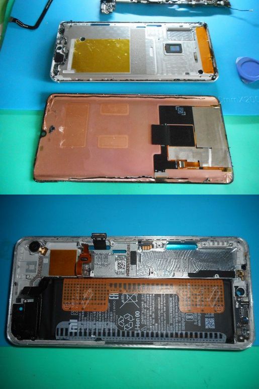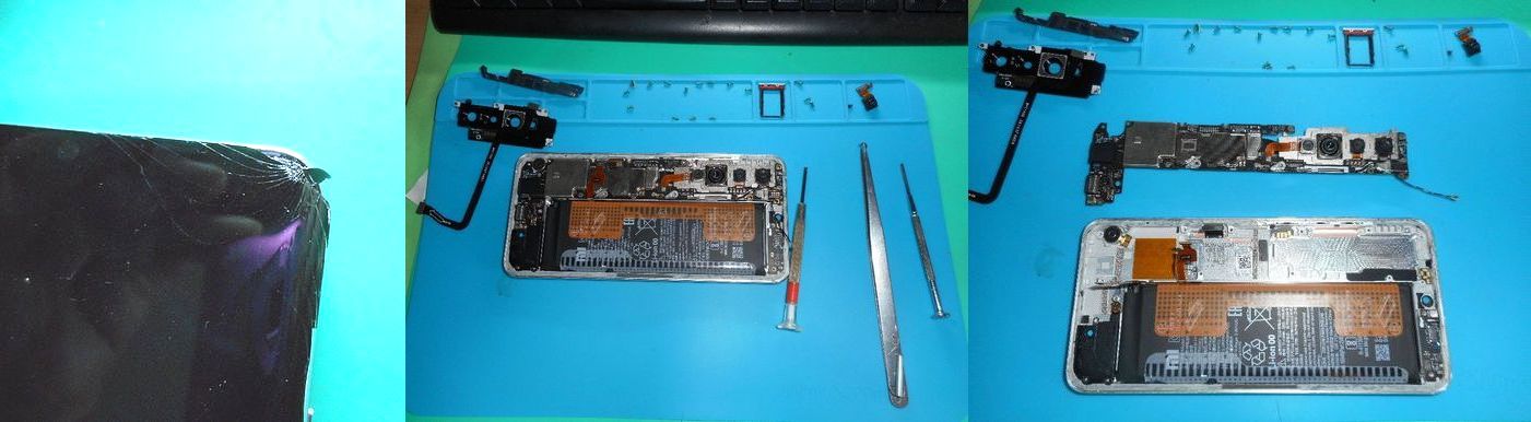 左が破損している液晶面ですね~修理用のブルーのゴム製シートを引いて実施、この修理ゴムシートには上部に枠がありまして、ネジや部品を置ける様になっています。そうです小さな螺子も20本以上ありましたね~~爺には非常疲れます。螺子を外してコネクターやケーブルなどを外しますね^^