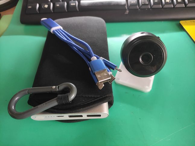 その小型カメラとモバイルバッテリー(丸いのがカメラ)左がモバイルバッテリー