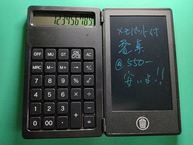 それは、電卓です。と言っても、目も書きパットが付いてまして、電卓の蓋?にメモが書けるんですよ^^驚きですよね~~そして価格が@550、安いですよ。