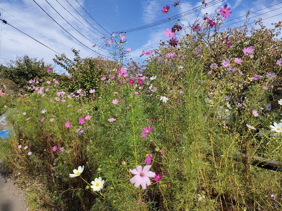 先般、散歩時の風景~~老いたる爺婆の健康維持には散歩が重要ですね~~と思いつつ、体調壊さない程度の散歩を遣ってます。先般、周辺を歩いた際には側道の花も綺麗ですよ~~ あぜ道の周辺でも、季節的な花としてコスモスが綺麗ですね^^ その近くの壁越しには、果物も鈴なりですね~~ 1個頂きたいな~~窃盗ですよね(苦笑) この地域には柿や栗に柑橘系が育ち易いのでしょうか?多く見ることが出来ますね。