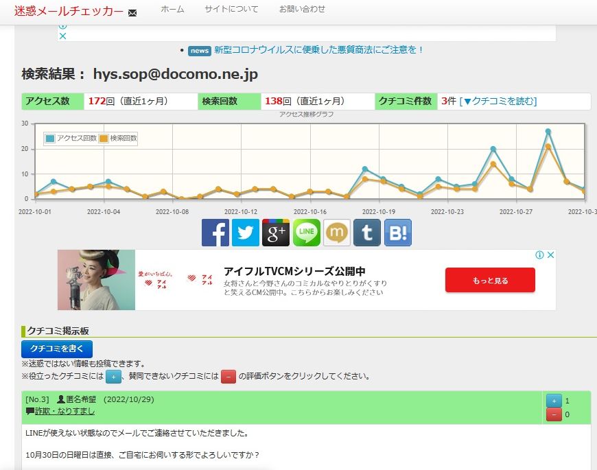 とは別に、詐欺ではと疑います。そして早速アドレスをwebで検索しましたら、出て来ましたよ~~