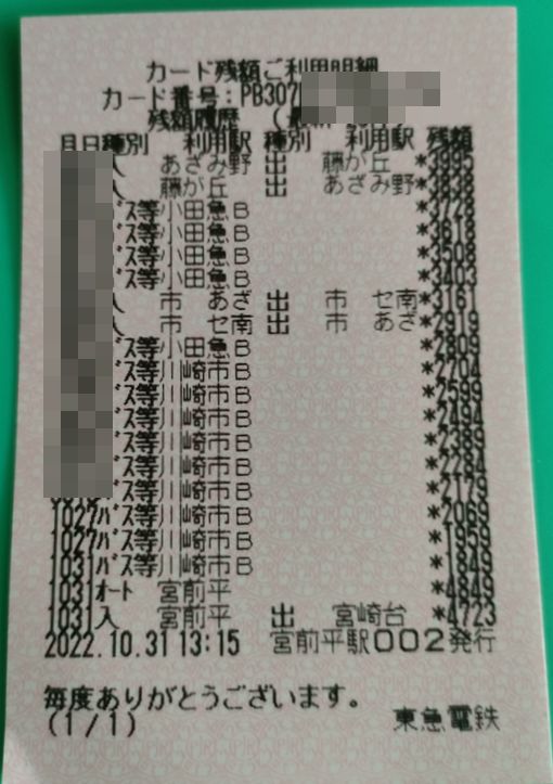 食事も済ませて、駅まで歩きましたよ。駅前からバスで帰宅ですが、その前に東急電鉄の発券機にて、爺のPASMOの乗車利用履歴と都度の乗車費用の確認をしました。