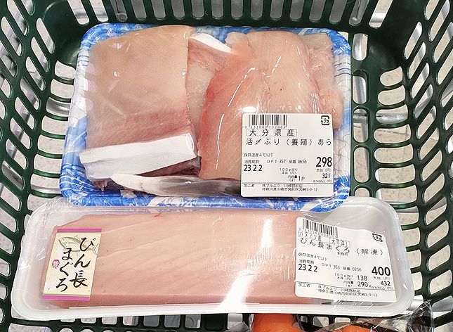 行くと、人が多いのに驚きました^^大半が爺婆ですね~広告見て押しかけでしょう~~年金生活者には値上げ値上げで生活大変です。爺が目的の「びんちょうマグロ」を見ていると、婆さんが手元に2個持って他のも選別している、隣には爺さんも選別で手を伸ばす為に、家の婆さんカートが邪魔で手が出せず(ー-)やっと爺さんが離れたスキに1個ゲットしました。