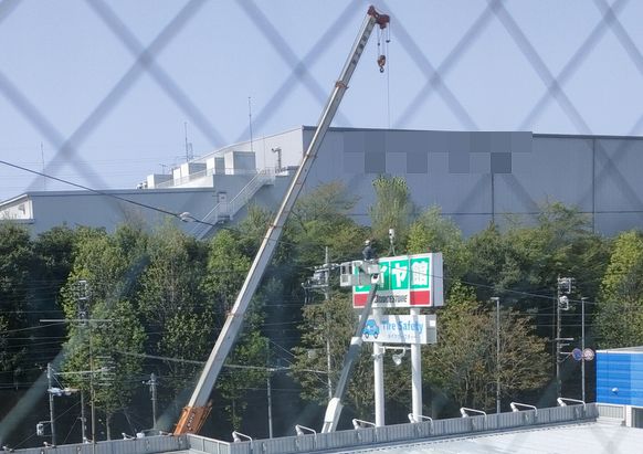何を遣っているのかな??我家の窓から見ていると、大きなクレーンが道路側に見えます??何が始まるのかな~~ 良く見れば、道路沿いの看板にに近寄ってますね~ そうです、看板を交換するのかな??別のクレーンには人が乗ってますね~~ 看板の交換じゃない?何を遣っているのか?最終的に出来上がったのが下の状態ですね。 結果、大きな看板の下に有った少し小さめの看板を外しましたね。 此処はブリジストンタイヤを交換を専門とする販売店舗ですね。爺は使った事は有りません。車検時の消耗時に交換しております。この看板の横幅は5m程?縦幅は2m程かな~~意外と大きいですね。 時折コンプレッサーの音等が聞こえますが、普段は静かに仕事をこなしていますね^^