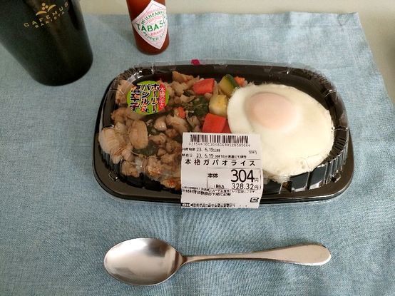 購入品は雑貨品ではあるものの、バナナやパンとヨーグルトは「クリエイト」の方が安いので買わない^^他にはお水が安かったもので2箱購入+爺の必需品であるビール1箱、他諸々と購入した上で、弁当も買おう~と言う、なら「ガバオライス」ですね~@304円(過去には299円でしたが~値上げ)を購入しました。