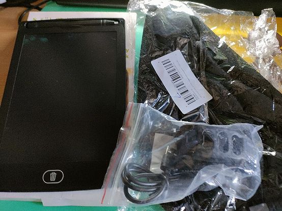 左側のタブレットに見えるのは、電子お絵描きできるボード(黒い面にタッチペンで書ける代物ですが~)は電池入れずに使える??その変わり明暗が低い点かな~これはA5サイズで500円以下でしたよ^^